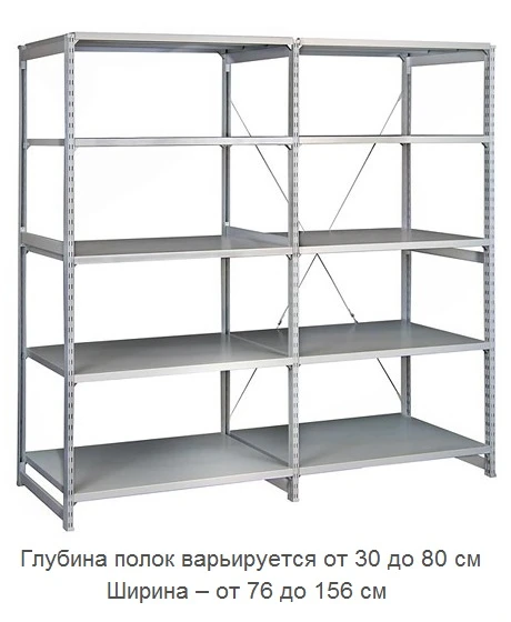 - Металлические полки с максимальной нагрузкой на полку – 150 кг или 300 кг (усиленные полки).