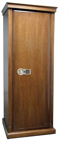 — Внутренняя отделка – эффектный красный бархат, успешно оберегающий оружие от царапин. Снаружи – декоративная отделка натуральным деревом и шпоном дуба. — Дверь снабжена электронным замком PS-300 высокой секретности (class A, ECB-S) с эксклюзивным покрытием «GOLD». Замок обладает энергонезависимой памятью и наружными контактами для открывания при разряженной батарее. Допускаются коды из 6-8 цифр. Питание от батареи 9В типа «Крона».