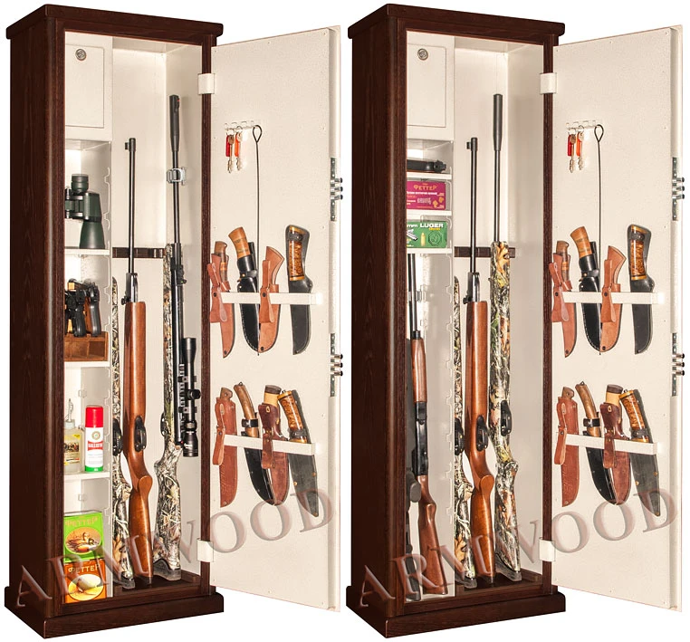 - Внутри сейфа есть запираемое (патронное) отделение и деревянные ложементы, можно дополнительно установить три съёмные полки (если полки не устанавливать в сейф помещается 5 стволов).
